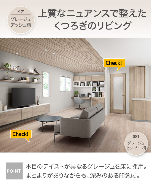 グレイッシュ空間は、同じ色味で風合いの異なるものを組み合わせることで空間にぐっと深みが出ます。床材にグレージュ系のカラーを取り入れるなら、より穏やかな印象の木目を持った「#グレージュヒッコリー柄 」がおすすめです。