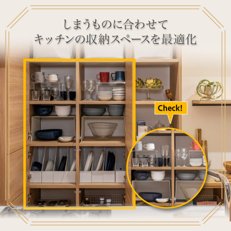 サイズが異なるお皿やグラスなどの食器類は、種類別に空間を仕切ることで無駄なく出し入れができます。