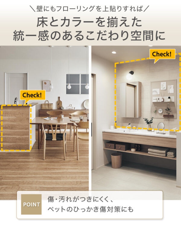 「#ウスイータ 」は、壁面にも両面テープで施工が可能。床と合わせてリフォームすれば、床面と壁面を同じカラーで揃えた統一感のある空間づくりが可能です。傷や汚れにも強いので、ペットのひっかき傷対策などにもおすすめ。